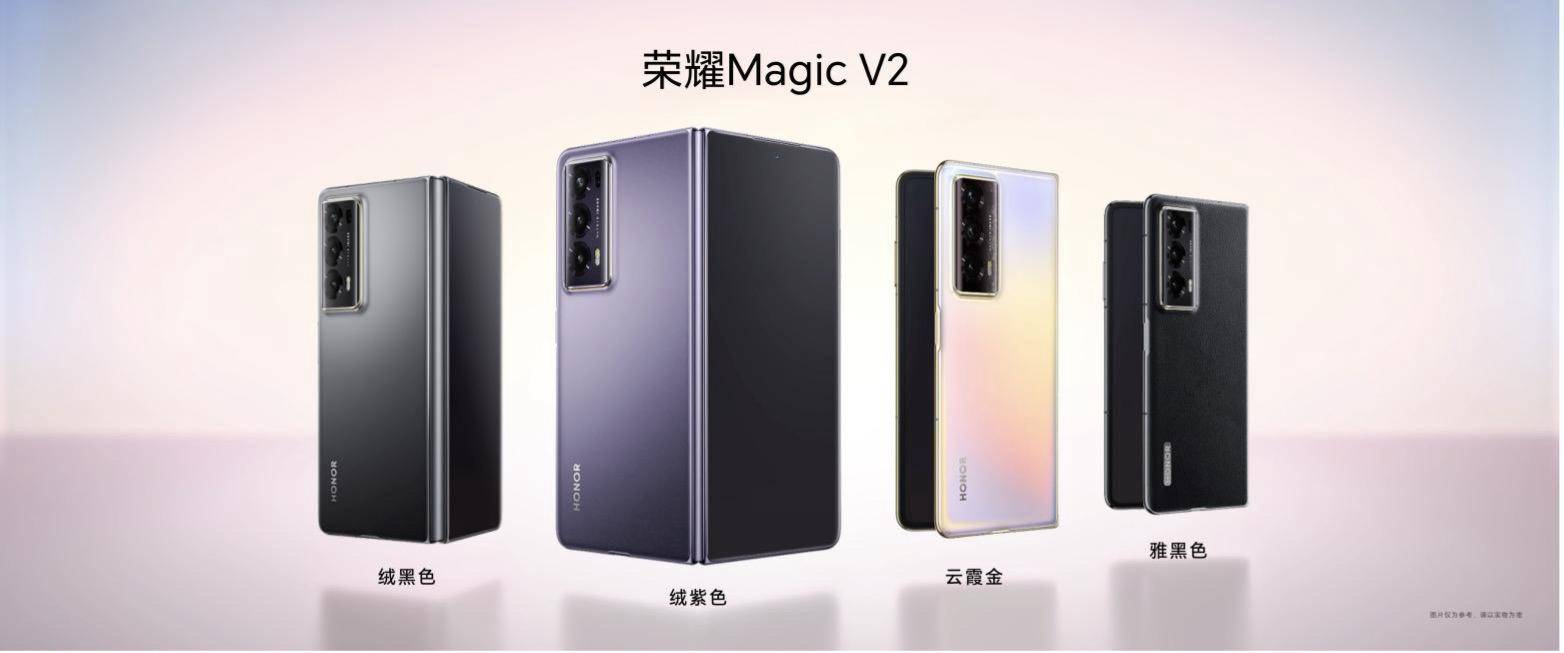 荣耀MagicV2供给雅黑色、绒黑色、绒紫色、云霞金 4 款配色,16+256 GB版价格8999,16+512GB 版价格9999元。荣耀MagicV2 至臻版 16+1TB版别价格11999元。